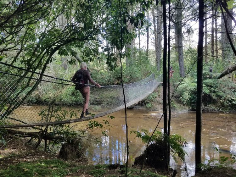 Früh an nächsten Morgen traf ich im Hot Whirlpool eine US-Amerikanerin, Sally, die seit über 20 Jahren in Neuseeland und inzwischen hauptsächlich auf dem Gelände AONC lebt. Sally erwähnte, dass sie für später ein "Arbeitsbienen-Treffen" organisiere, um einige der invasiven Pflanzenarten zu beseitigen, die die einheimischen Pflanzen in den unbebauten Teilen des Grundstücks zu ersticken drohen. Obwohl wir geplant hatten, zu einem der Strände westlich von Auckland zu fahren, beschlossen wir alle, dass es Spaß machen würde, weitere Naturisten aus Neuseeland zu treffen, während wir unseren Teil für die Umwelt in Neuseeland tun, also haben wir uns freiwillig für diese Gemeinschafts-Aktion gemeldet. Dan und ich entfernten Reste einiger unerwünschter Bäume, die bereits gefällt worden waren, und John und Rainer rupften Ranken aus, oft als "Dreimasterblume" bzw. "Zebrakraut"2 bezeichnet, ein Bodendecker, der sich gnadenlos ausbreitet, aber leicht herauszuziehen ist. Unsere ehrenamtlichen Bemühungen brachten uns ein kostenloses Mittagessen ein, was uns weitere Gelegenheit gab, uns mit den anderen beteiligten Naturist(inn)en zu unterhalten.
