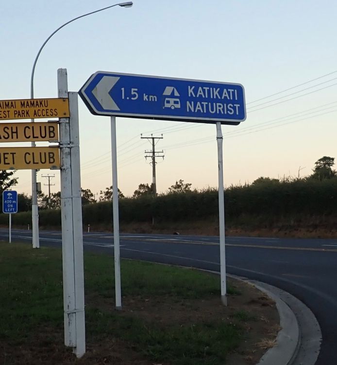 Nachdem wir das geothermische Wunderland in und um Rotorua verlassen hatten, fuhren wir unerschrockenen Naturisten nach Norden und checkten im Katikati Naturist Resort ein. Es war interessant festzustellen, dass das Schild an der Hauptstraße ungeniert die Richtung zum naturistischen Campingplatz verkündete. Wir fanden eine angenehme, ruhige Anlage mit einem schönen Hot Whirlpool und einer komfortablen Miethütte, die dank eines von der Leitung zur Verfügung gestellten, aufblasbaren Bettes uns alle vier unterbringen konnte. Wir trafen ein paar andere Naturist(inn)en im Hot Whirlpool und auf dem Gelände.