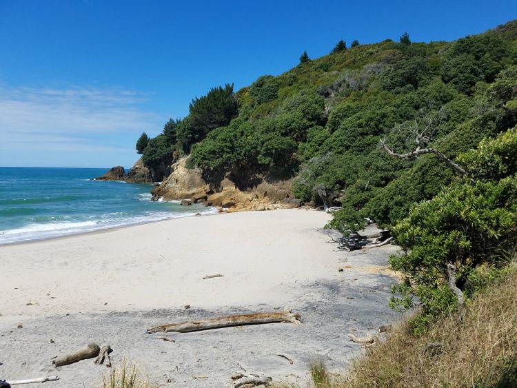 Der nächste Tag war der 1. März. Wir hatten gehofft, die Bay of Plenty (BOP) Naturist(inn)en am Opoutere Beach wiederzusehen, wo sie für das Wochenende campen wollten, bevor sie ihre Nordland-Wohnmobil-Tour starteten. Leider mussten wir feststellen, dass keiner von ihnen vor dem Abend ankommen würde, und wir würden bis dahin weiter nördlich sein. Wir trösteten uns, indem wir nackt vom Nordrand eines beliebten Badeortes, Waihi, nördlich über eine Landzunge zu einem meist einsamen und schönen Strand namens Orokawa Bay wanderten. Es war der perfekte Ort für ein nacktes Mittagessen und Bad.