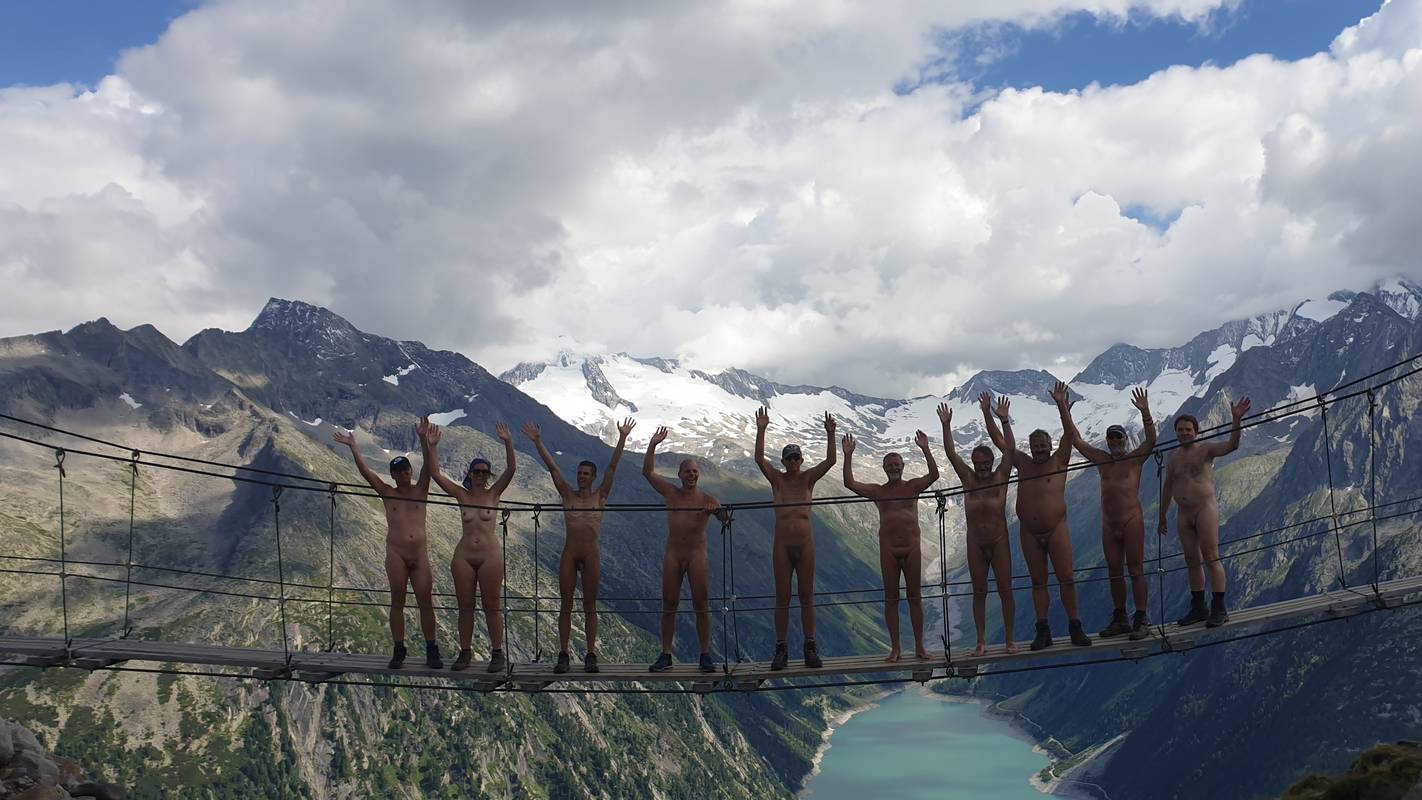 Einmal traf die nackte Wandergruppe auf eine Hängebrücke. Wir warteten geduldig in einer Schlange von bekleideten Wanderern nahe einer Hütte oberhalb des bekannten Schlegeis-Stausees. Alles stand unter dem Motto »Bloß zusammen leben«. - Rainer