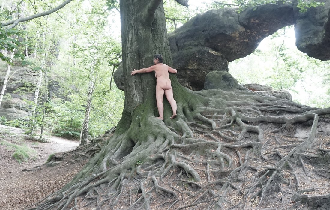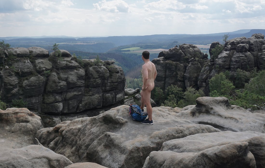 Zur Samstagswanderung versammelten sich 38 Naturist*innen in Ottendorf am FeWo-Domizil, von wo aus zunächst der erste Kilometer bis zum Ortsrand bekleidet zurück gelegt wurde. Danach wurde der nahe gelegene Arnstein erklommen. Der teils steile Aufstieg enthielt ein paar Passagen, an denen man sich klein und schlank machen oder auch die Arme zu Hilfe nehmen musste, um ans Ziel zu gelangen.
