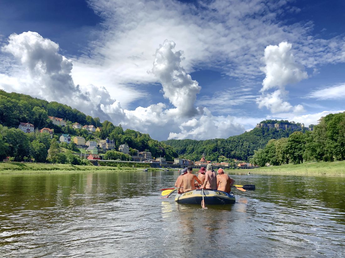 Bereits 2018 und 2019 wurde die Möglichkeit, das Elbtal vom Wasser aus nackt paddelnd zu erkunden, gerne angenommen. Diesmal waren 25 Naturist(inn)en interessiert und reisten von der Hütte per Linienbus nach Bad Schandau. 24 davon verteilten sich auf drei Schlauchboote, einer bevorzugte ein Einer-Kayak.