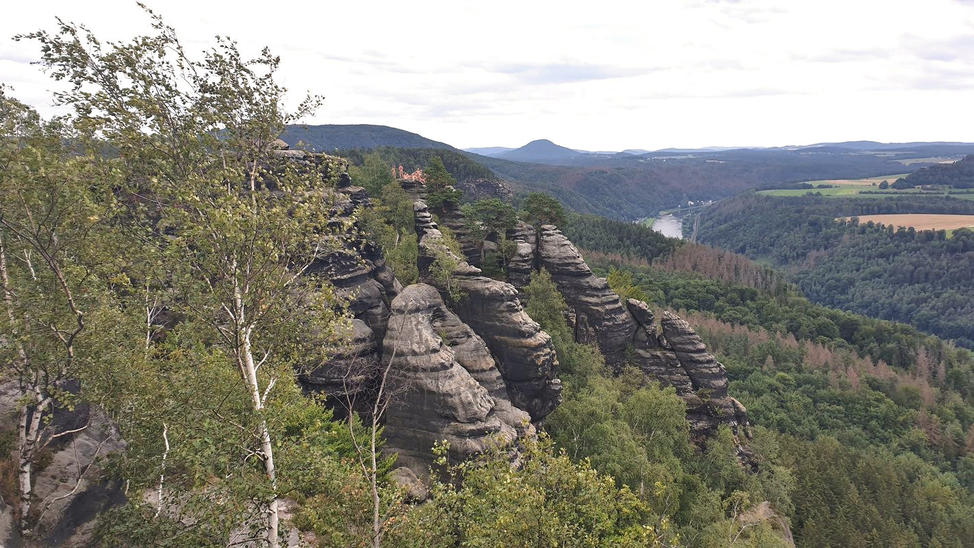 stetig wie die Wanderung zu Beginn aufwärts führte, folgte - nach einer letzten, spektakülären 270-Grad-Aussicht, die nur 4 oder 5 der Wander*innen sehen wollten, ein langer, teils steiler Abstieg, der an den steilsten Stellen über Treppen geführt wurde. Nach rund 10 km konnte man sich dann auf eine leckere Stärkung im Restaurant »Zur Schloßbastei« in Bad Schandau freuen.