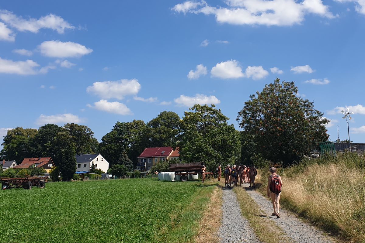 Dabei entdeckten wir, dass der Heimatverein des Dorfes unter dem Motto »Endlich mal was los« unsere Nacktwanderungen rund ums Kirnitzschtal auf seiner Info-Tafel angekündigt hatte. Bezug genommen wurde dabei auf einen Artikel der