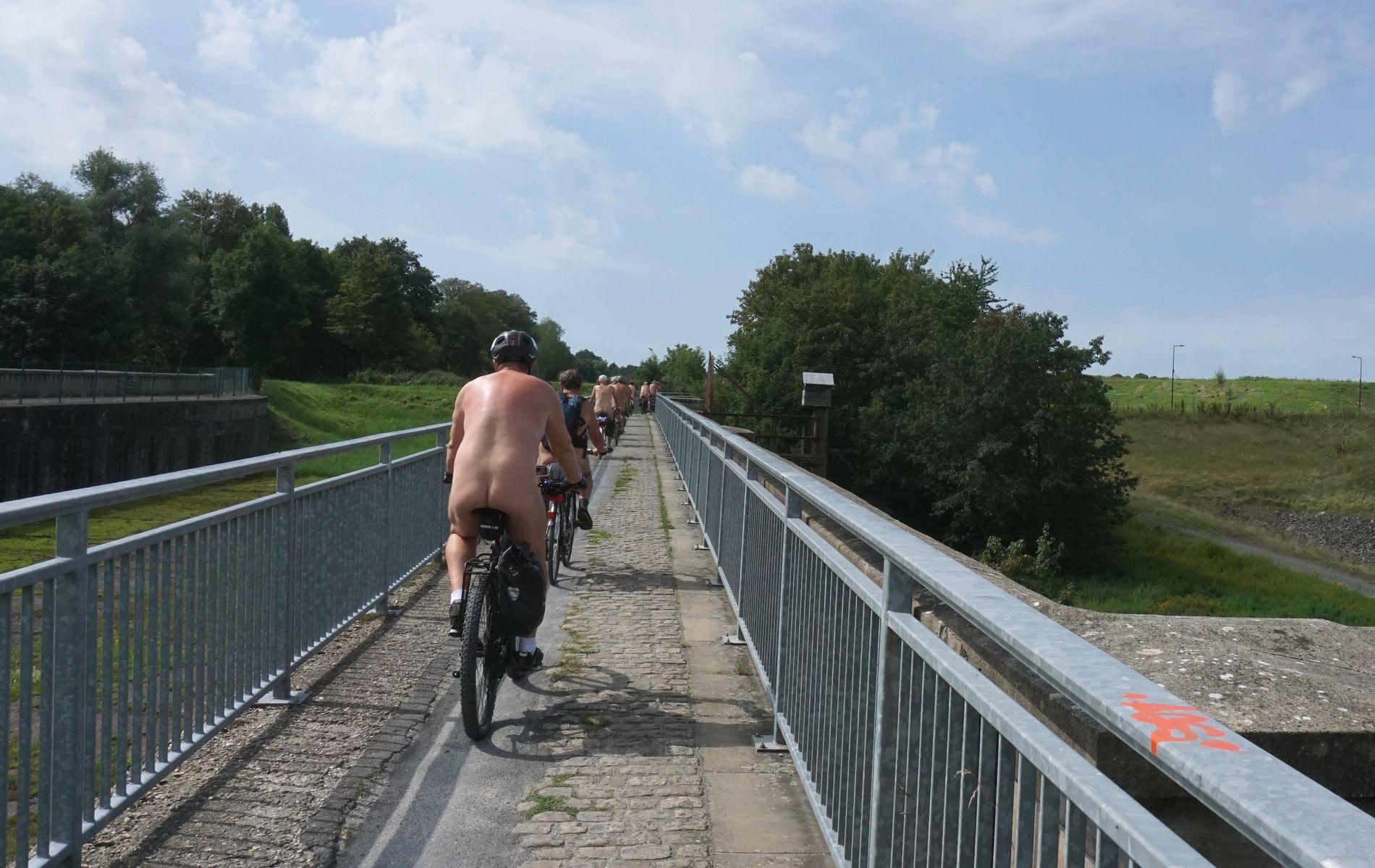 Viele Radfahrer fahren mit einem fröhlichen „Moin“ an uns vorbei. Ein Paar verlangsamt sein Tempo und ruft: „Seid Ihr die, die gestern nackt im Eiskeller waren?“ Ein vielstimmiges „Ja! “ lässt keinen Zweifel. 15 Min. später geht es weiter, und nach ca. 30 Min. erreichen wir den Parkplatz. Die meisten Mitwanderer (auch ich) beschließen, auf Grund der Wärme und Schwüle die Wanderung hier zu beenden. Mit einer Hand voll Unverdrossenen bricht Rainer nach einer Pause wieder auf. Aber auch sie verkürzen die 2. Hälfte der Tour Temperatur-bedingt ab und erreichen gegen 17 Uhr fast zeitgleich mit den Radlern erschöpft, aber zufrieden den Parkplatz. Bei der anschließenden wohlverdienten Einkehr lassen wir den Tag ausklingen. Und wir alle sind uns sicher, dass wir heute wieder viele neue Brücken zu bekleideten Wanderern und Radlern gebaut haben. - Birgit