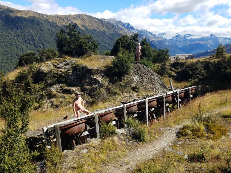 Am neunten Tag wanderten wir nackt rund um die Ruinen der Bendigo-Goldmine am Berg mit Blick auf das Clutha-Flusstal. Am nächsten Tag mussten wir zurück zum Flughafen in Queenstown, um für die zweite Etappe unseres "Nude Zealand Adventures" zur Nordinsel zu fliegen und dort unsere Suche nach naturistischen Möglichkeiten in Neuseeland fortzusetzen.