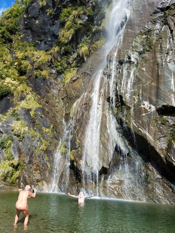 Am dritten Tag hatten wir eine persönliche Vereinbarung nur für uns mit einem Wassertaxi getroffen, um uns über einen Fluss zu einer schönen Rundwanderung und einem hohen Aussichtspunkt zu bringen. Unsere Vereinbarung gab uns einen Vorsprung von einer Stunde gegenüber anderen, die gemäß dem regulären Fährplan ankamen, so dass wir im Wesentlichen die gesamte Strecke nackt absolvieren konnten. Spät am Tag gelang uns ein nacktes Bad im nahegelegenen Lake Manapouri. Und da es spät am Tag war, gingen wir nackt zurück zum Auto entlang eines Teils des berühmten Kepler Track (einer von Neuseelands "Great Walks") und trafen dabei nur noch auf sehr wenige Wanderer.