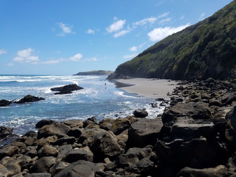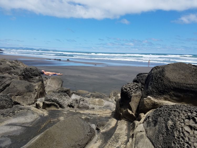 Unser erster Halt war die Strand- und Surfergemeinde Raglan. Am ersten Tag, nachdem wir die nahe gelegenen Bridal Veil Falls besucht hatten, gingen wir zum südlichen Ende des langen und wunderschönen Ruapuke Beach, einem schwarzen Sandstrand, der von Dünen und Klippen umgeben ist. Einige professionelle Hunde-Ausführer kamen vor uns dort an, aber der Strand war bei Ebbe so groß, dass wir nackt gehen konnten, ohne womöglich jemanden zu verärgern. Wir umrundeten eine Landzunge und genossen die Sonne, die Brandung und die Felsen über Mittag. Der einzige Wermutstropfen war, dass der kleine Wasserfall, der direkt auf den Strand fiel, in den Dan sich natürlich sofort stürzte, unangenehm roch - vielleicht wegen Kuhweiden oben auf den Klippen.