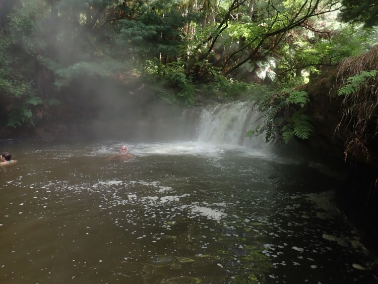 Nach den Kaiate Falls fuhren wir zu den viel höheren Wairere Falls. Wir mussten auf dem Weg zum ersten Aussichtspunkt am Fuße der Wasserfälle bekleidet bleiben, aber nur wenige Leute machen den steilen Aufstieg zum Gipfel, also genossen Dan und ich eine vollständig nackte Wanderung bis zum Gipfel und dann wieder nach unten. Zurück in Katikati konnten wir "unsere müden Knochen in dem einladenden Hot Whirlpool einweichen".