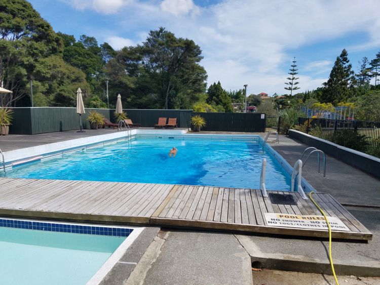An diesem Abend fuhren wir etwa 40 Minuten zurück in Richtung Süden, um mit etwa 25 Mitgliedern der Bay of Plenty Naturists (einer landlosen1 reisenden Gruppe) ihr monatliches Warm-Bad in einem großen heißen Pool zu nehmen. Das Startgeld von nur 30 NZD [ca. 15 EUR] schloss ein leckeres Abendessen mit Wahlmöglichkeiten für jeden Gang ein. Wir trafen einige Mitglieder der freundlichen Gruppe, darunter Graham (der mit John über die Free Range Naturism Website korrespondiert hatte) und Glenne, die Organisatorin der großen und aktiven Gruppe. Ein Großteil ihrer Diskussion bezog sich auf ihren Plan, eine Woche später eine einmonatige, naturistisch orientierte Wohnmobiltour durch den nördlichen Teil der Nordinsel zu beginnen. 19 Wohnmobile waren zur Teilnahme angemeldet, was ich für einen kleinen Inselstaat sehr beeindruckend fand.