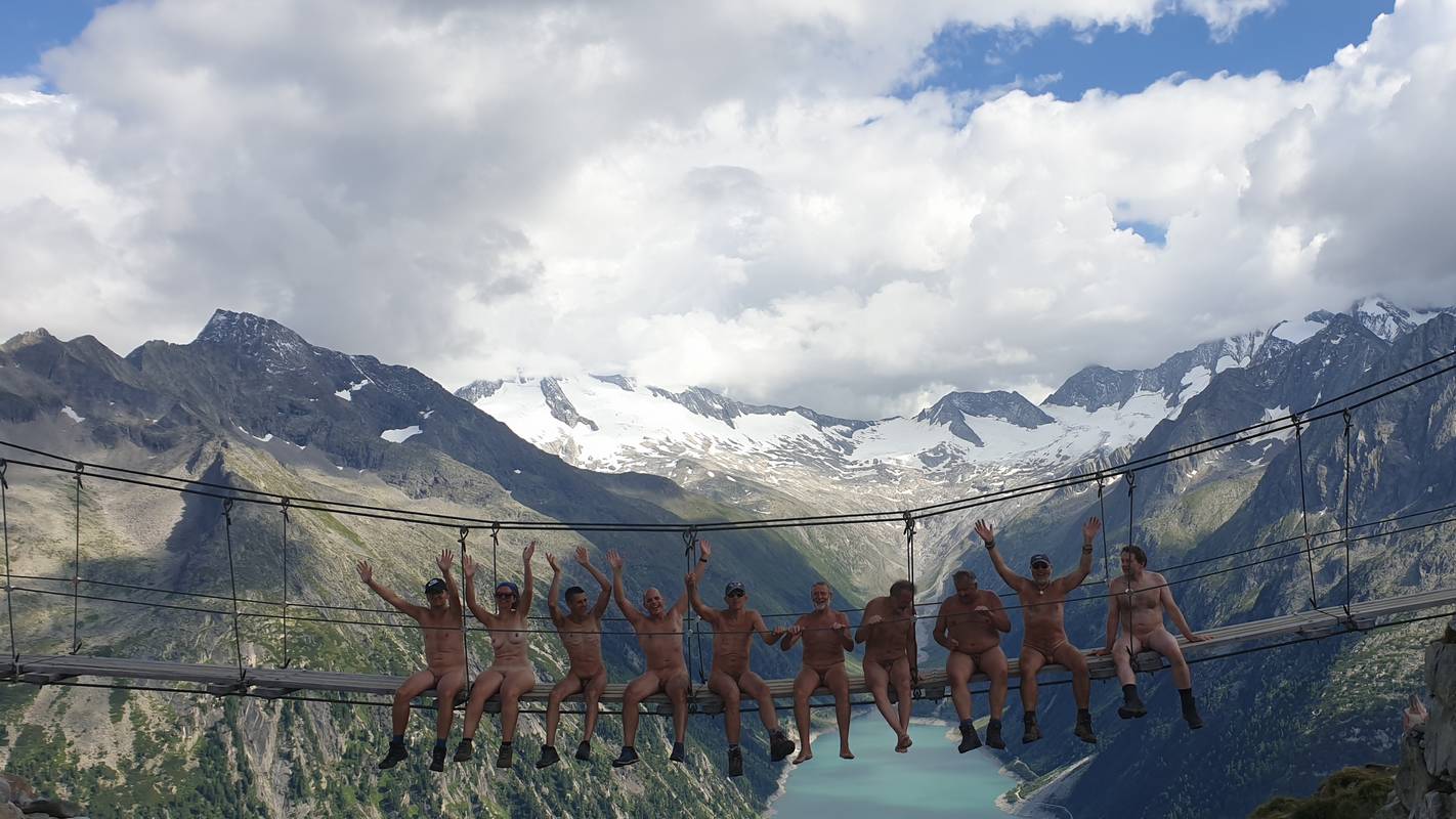 Einmal traf die nackte Wandergruppe auf eine Hängebrücke. Wir warteten geduldig in einer Schlange von bekleideten Wanderern nahe einer Hütte oberhalb des bekannten Schlegeis-Stausees. Alles stand unter dem Motto »Bloß zusammen leben«. - Rainer