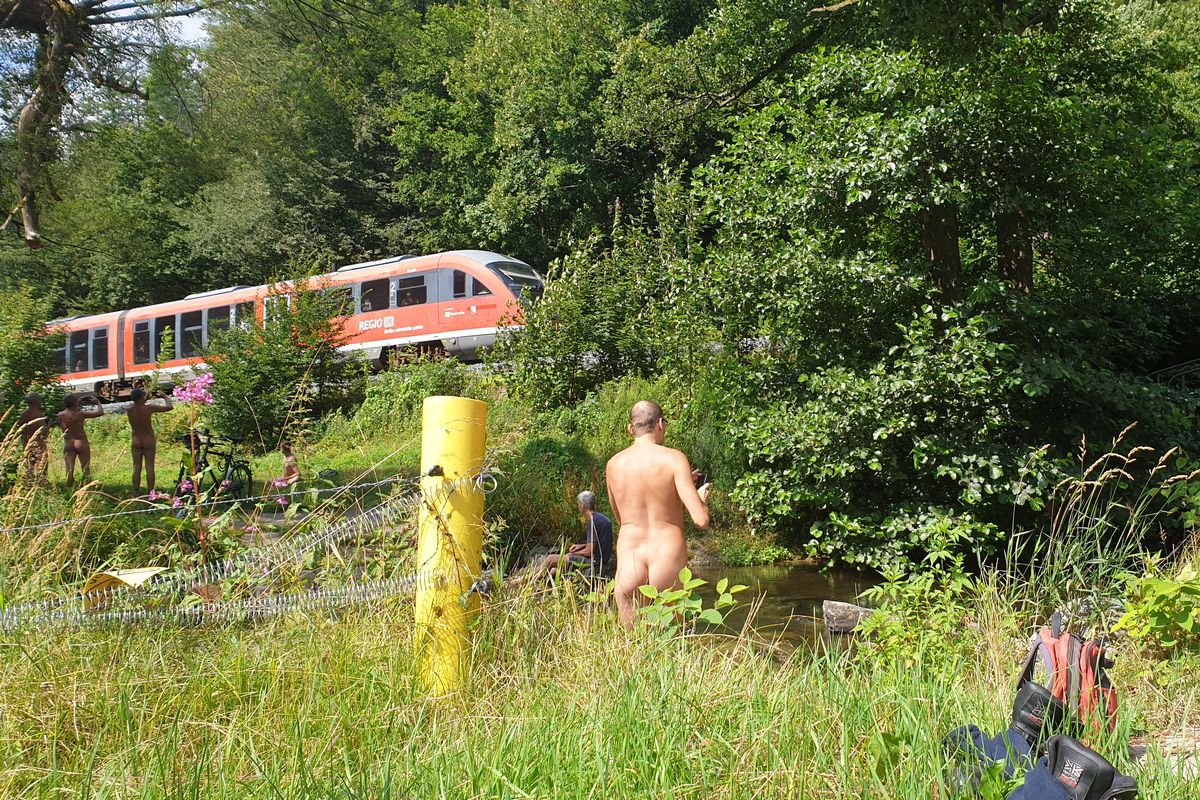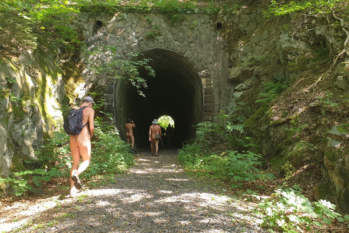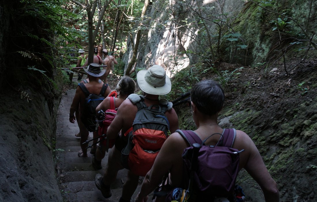 Auf den großenteils schmalen Pfaden traf die nackte Wandergruppe von 36 Personen immer wieder auf entgegen kommende Gruppen und Familien, so dass es regelmäßig zu kleinen Staus kam, um die entgegen kommenden passieren zu lassen. Meist kam es dabei auch zu Gesprächen, und zwei junge Damen mit Hund interessierten sich sogar für die Möglichkeit, an einer der Wanderungen der nächsten Tage mitzumachen.