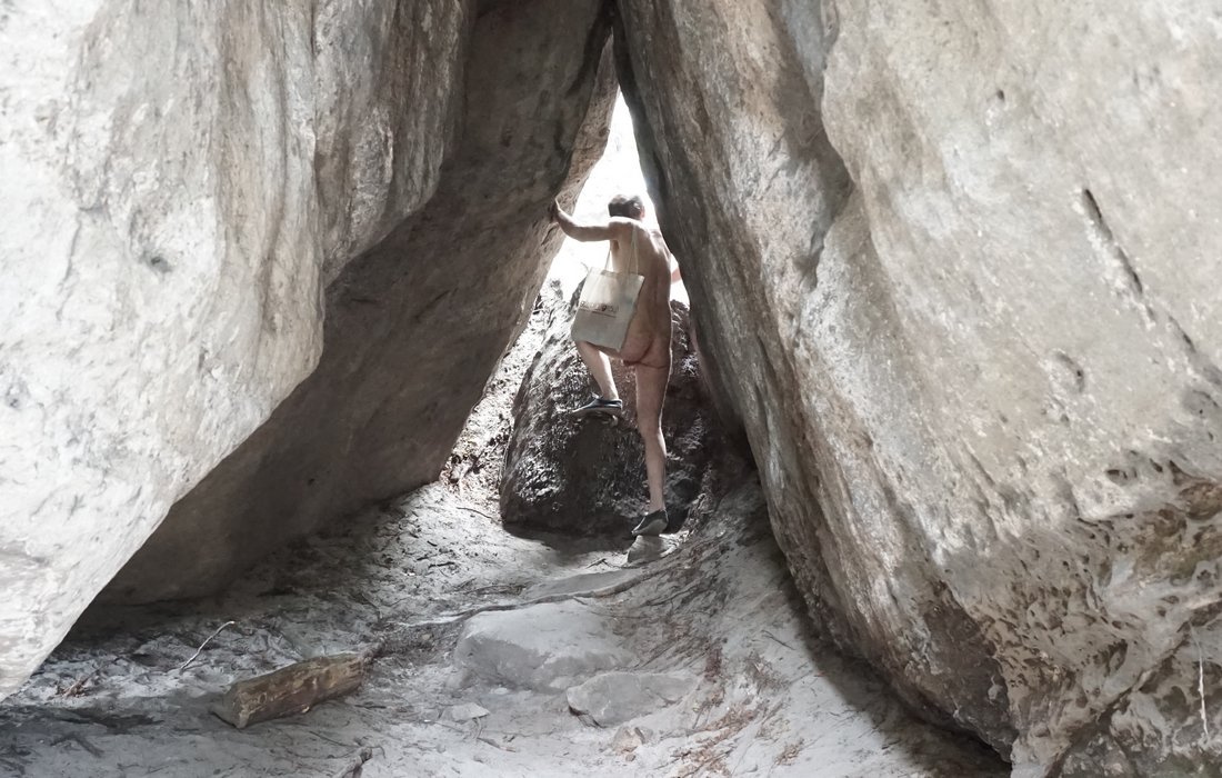 Regen begleitete den Aufstieg zum »Winterstein«, der auch »Hinteres Raubschloss« genannt wird. Dort fanden wir in einer Höhle einen trockenen Rastplatz mit Aussicht. In der Höhle kamen wir mit einigen jungen Leuten ins Gespräch, die dort nach dem Aufstieg mit Kleidung und Regenschutz versuchten, wieder trocken zu werden. »Ja, ihr macht das richtig. Wir würden ja am liebsten auch nackt wandern, aber wir haben keinen Platz, um die Kleidung zu verstauen.« Textilträger halt: Wenn es ums Nacktwandern geht, sind sie um keine Ausrede verlegen.
