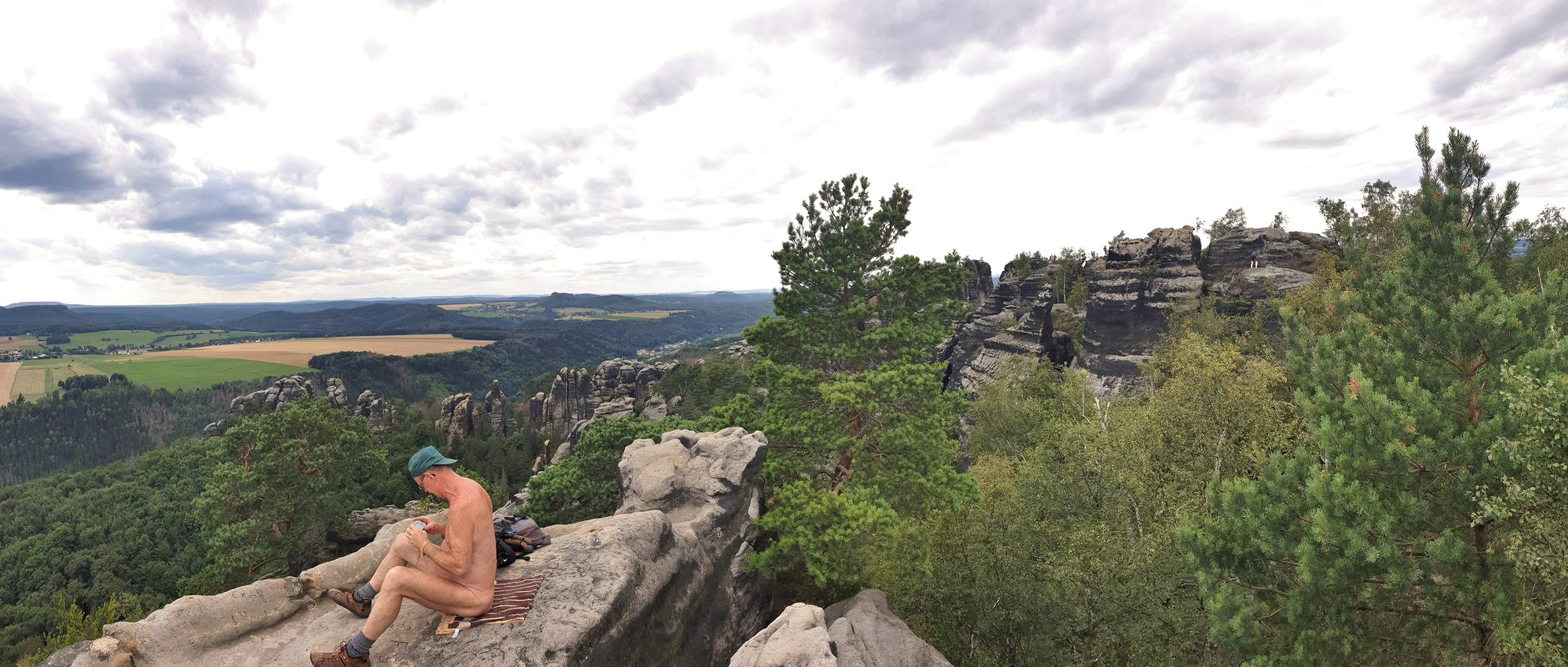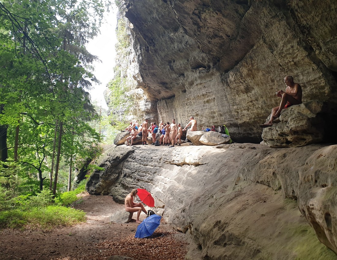 Zur Samstagswanderung versammelten sich 38 Naturist*innen in Ottendorf am FeWo-Domizil, von wo aus zunächst der erste Kilometer bis zum Ortsrand bekleidet zurück gelegt wurde. Danach wurde der nahe gelegene Arnstein erklommen. Der teils steile Aufstieg enthielt ein paar Passagen, an denen man sich klein und schlank machen oder auch die Arme zu Hilfe nehmen musste, um ans Ziel zu gelangen.