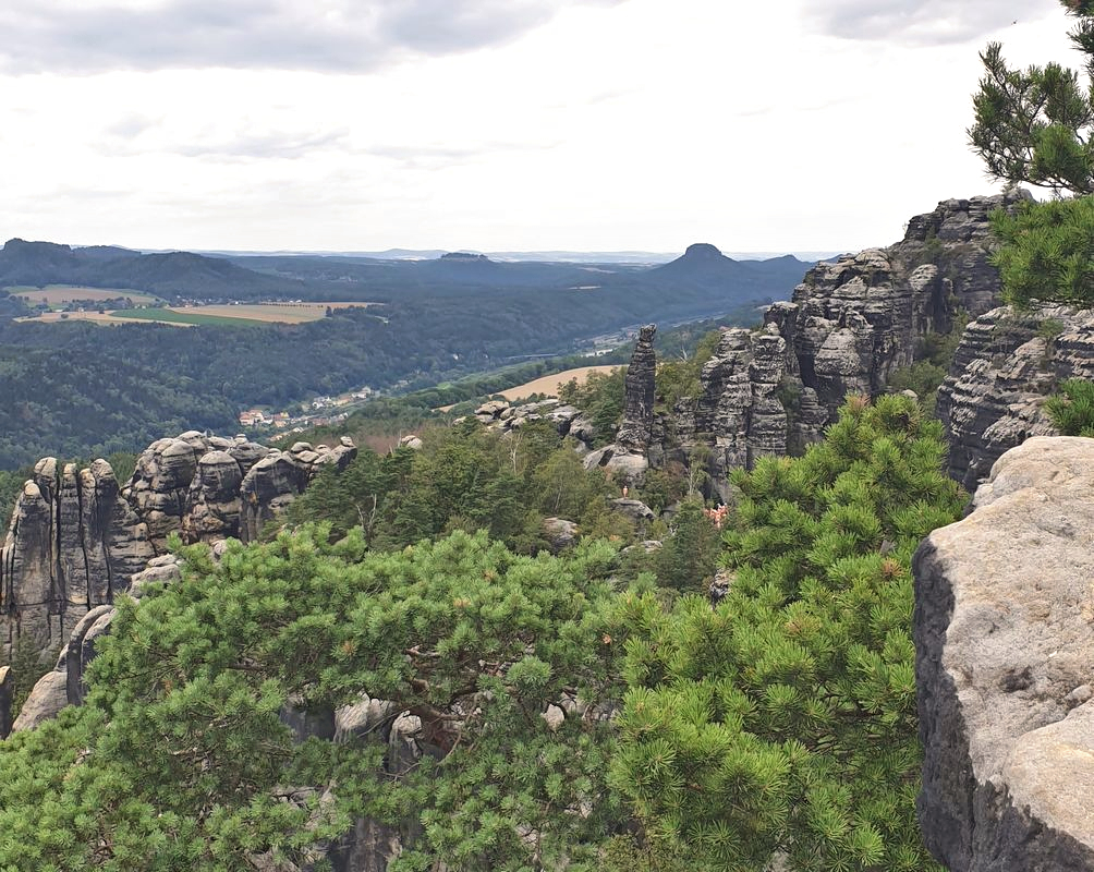 stetig wie die Wanderung zu Beginn aufwärts führte, folgte - nach einer letzten, spektakülären 270-Grad-Aussicht, die nur 4 oder 5 der Wander*innen sehen wollten, ein langer, teils steiler Abstieg, der an den steilsten Stellen über Treppen geführt wurde. Nach rund 10 km konnte man sich dann auf eine leckere Stärkung im Restaurant »Zur Schloßbastei« in Bad Schandau freuen.
