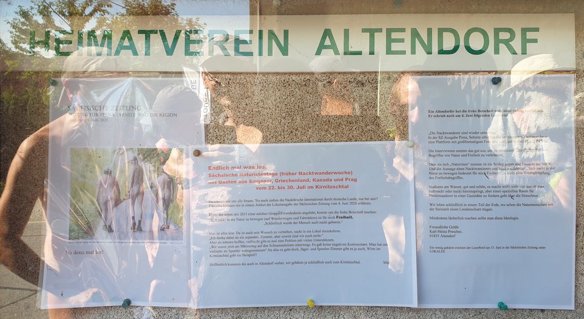 Dabei entdeckten wir, dass der Heimatverein des Dorfes unter dem Motto »Endlich mal was los« unsere Nacktwanderungen rund ums Kirnitzschtal auf seiner Info-Tafel angekündigt hatte. Bezug genommen wurde dabei auf einen Artikel der