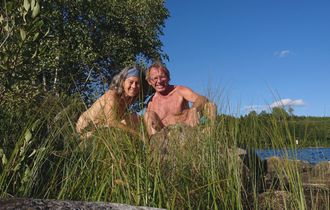 Der Naturistenplatz Sandviken (Sandige Bucht) an einem der schwedischen Seen im Värmland nördlich von Filipstad war Ausgangspunkt für eine Wanderung zum Blaubeer-Sammeln.