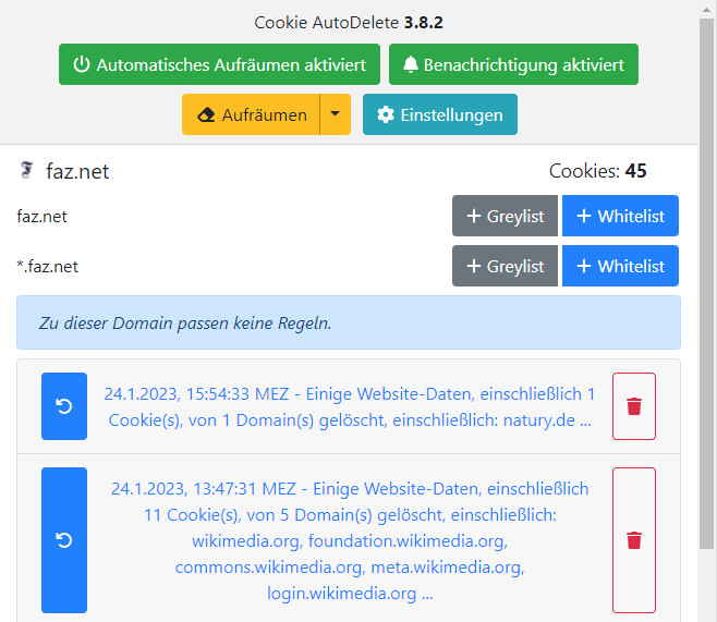 Beispiel für die automatische Löscharbeit von »Cookie Auto Delete«