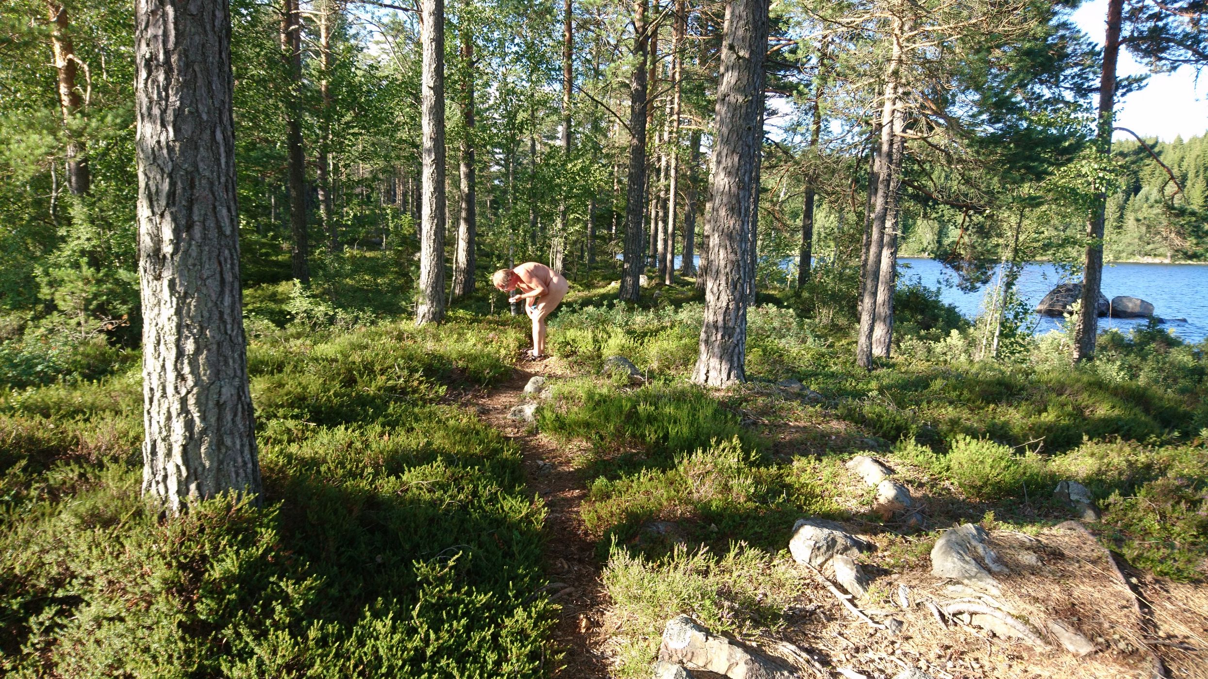 Von erfahrenen Dauercampern erfuhren wir, dass es sich lohnte, das Blaubeersammeln einzuplanen. Wir machten uns mit Sammelgefäß auf den Weg, genossen Wind, Sonne, erstaunlich wenige Mücken und Bremsen, und verfielen zunehmend in einen 'Pflückrausch', bis wir an eine Wegegabelung kamen, wo wir nur mit 'Klädda' (Kleidern) hätten weitergehen sollen, denn dieser Weg verließ zeitweise das Campinggelände.