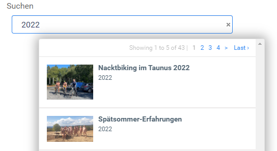 Das Suchergebnis erscheint in einem modalen Fenster. Rechts oben wird angezeigt, wie viele Artikel insgesamt gefunden wurden (max. 50), und wieviele davon auf der aktuellen Seite durchgescrollt werden können. Ggf. kann im modalen Fenster auf andere Ergebnis-Seiten geblättert werden. Im Beispiel-Bild gibt es 43 gefundene Artikel, davon werden 5 auf der ersten Seite angezeigt.