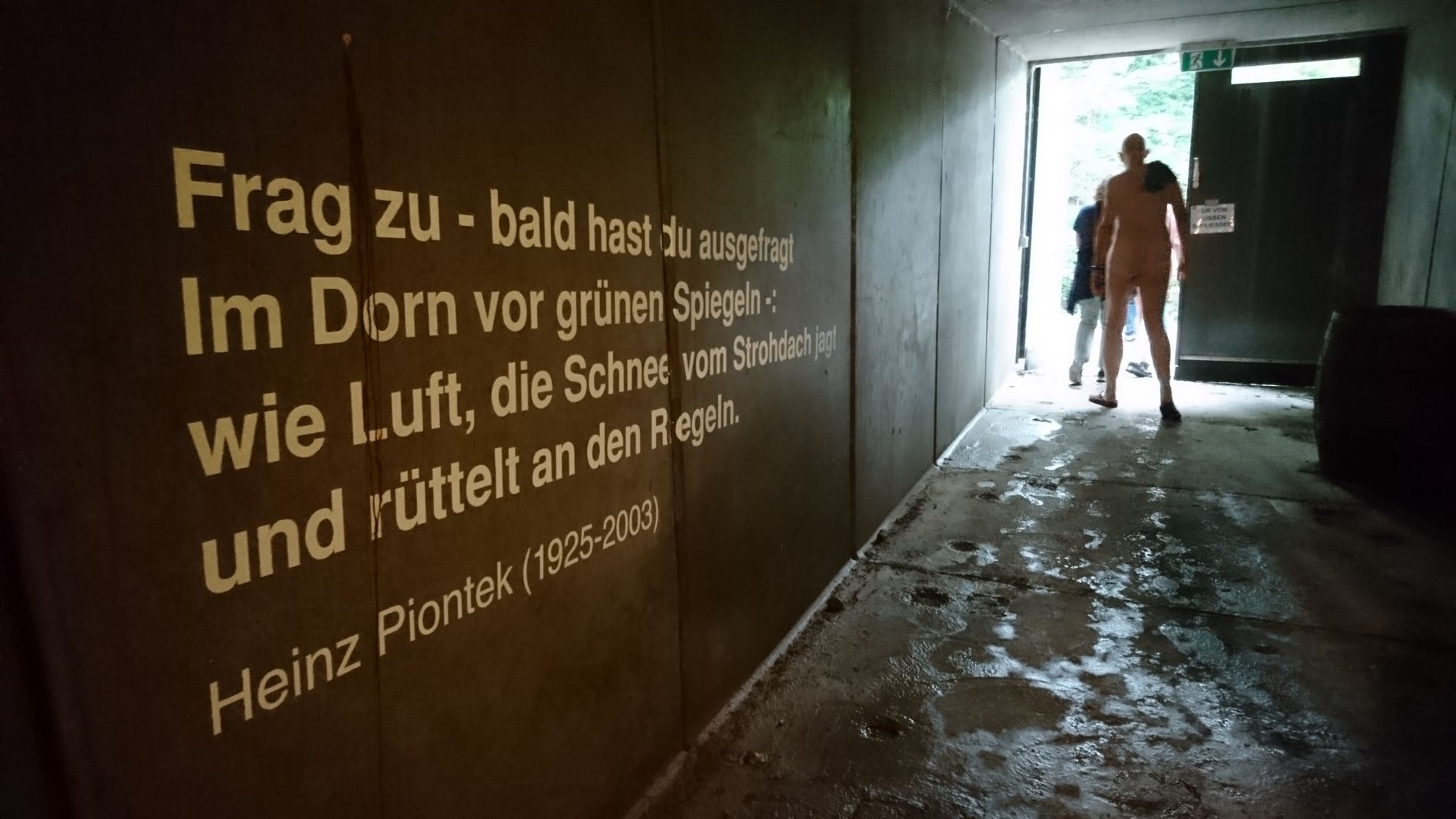 Es war von vornherein klar, dass wir dass Gebäude an anderer Stelle verlassen würden, als wir es vorher betreten hatten. Daher gingen wir davon aus, zwar nackt hindurch zu gehen, aber Kleidung mitnehmen zu müssen. Zu unserer Überraschung durfte – wer wollte – die Kleidung aber im Besucherzentrum lassen und nackt über den Schulhof gehen. Ein paar Kinder und Jugendliche spielten auf dem Platz und schauten etwas überrascht, aber auch amüsiert zu uns herüber.