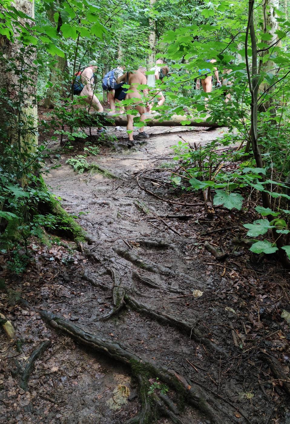 Nach der leichten Anfangssteigung erreichten wir einen Waldpfad. Der Regen hatte den Boden ziemlich aufgeweicht, so dass an zahlreichen Stellen Rutsch- und Sturzgefahr bestand.